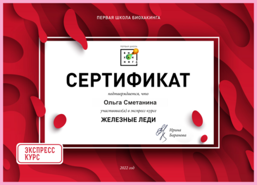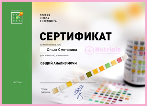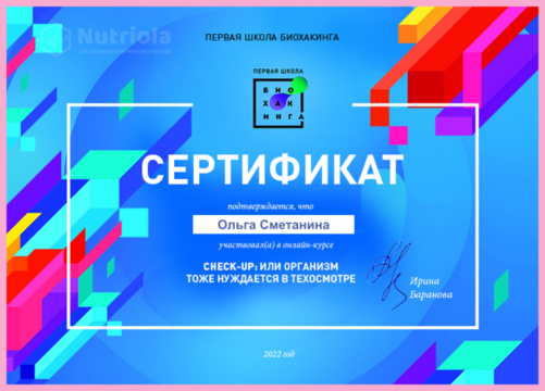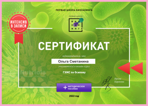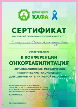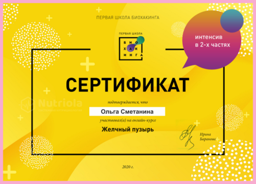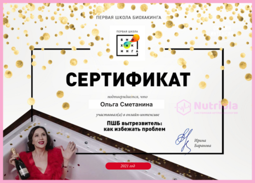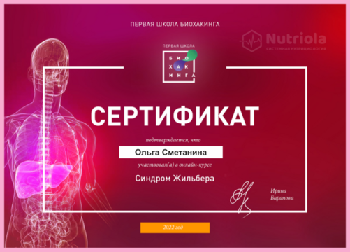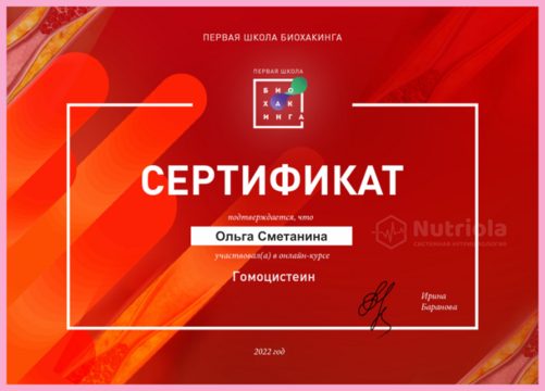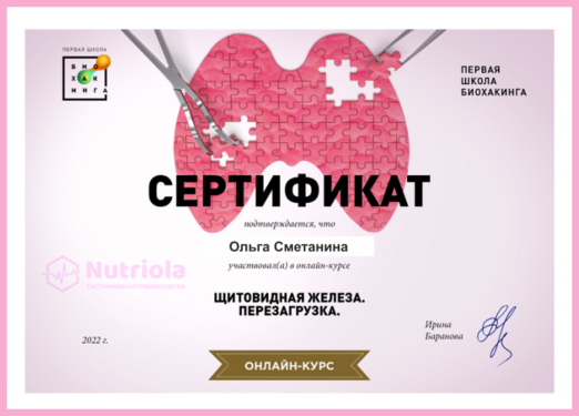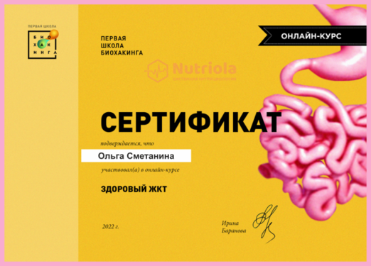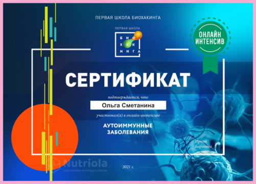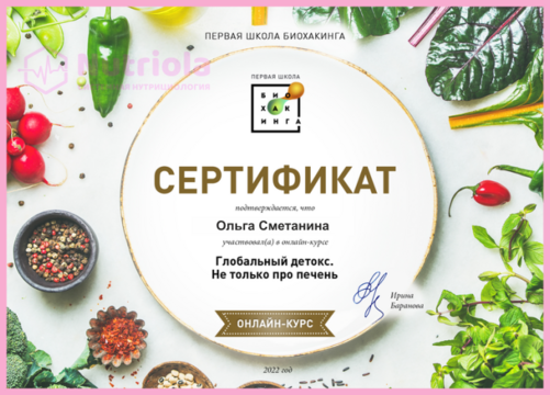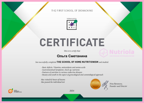 Дополнительное образование: "The school of home nutritionism", "Аутоимунные заболевания", "Глобальный детокс", "Гомоцистеин", "ГХМС по Осипову", "Желчный пузырь", "Кандида и паразиты", "Здоровый ЖКТ", "Менопауза. Всё о гормонах", "Общий анализ мочи", "Синдром Жильбера", "Щитовидная железа. Перезагрузка", "Эстрогенодоминирование".