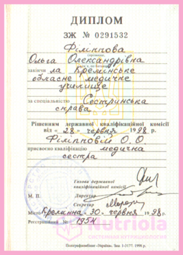 Базовое образование: Сестринское дело, Кременское областное медицинское училище, 1998 г., ЗЖ №0291532